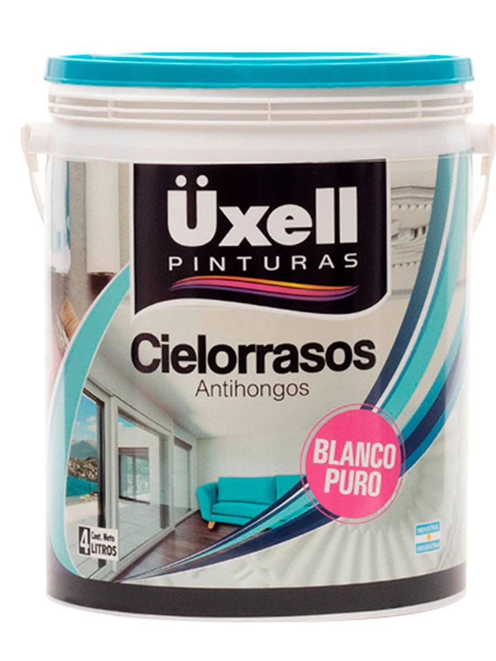 Cielorrasos Uxell está formulado para brindar una película antihongo de alta porosidad, previene la condensación de vapor de agua y su consecuente formación de manchas en la superficie. Posee un acabado mate de alto poder cubritivo y excelente nivelación. Seca rápidamente y sin dejar olor. Puede observarse una amplia gama de colores pasteles utilizando entonador universal, hasta un máximo de 30 cm3. por litro de pintura.